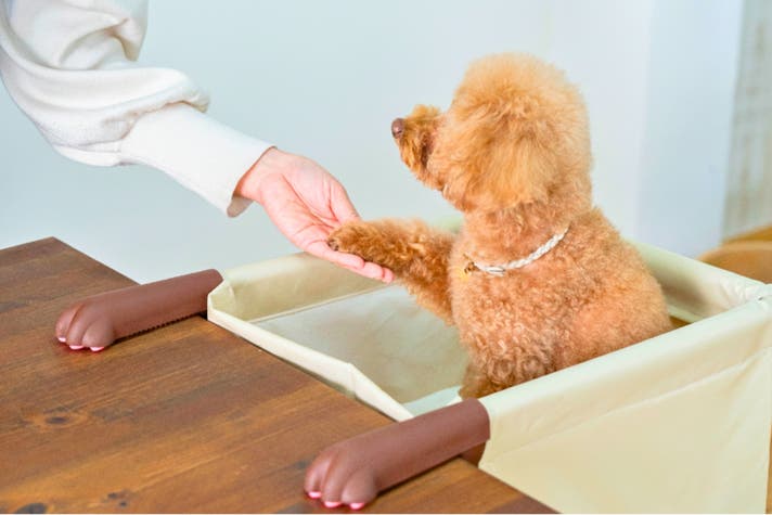 肉球アームのペットチェア『Chocorin(チョコリン)』は、落下や飛び出しを防ぐリード付き。安心して食卓の時間を楽しめます。