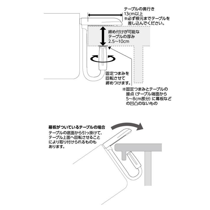 テーブルの天板をアームで挟み、固定つまみを回すだけで簡単に設置できます。