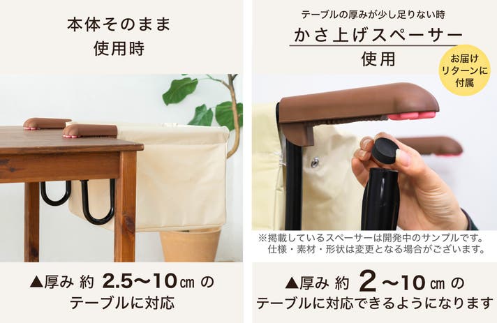 本体をそのまま使用した時は、テーブルの天板の厚みは約2.5~10cmの範囲で使用できます。