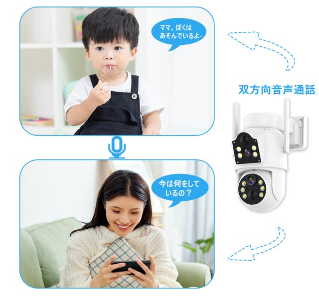 高精度のマイクとスピーカーを内蔵しておりアプリを通じてカメラの前の人と通話が可能です。