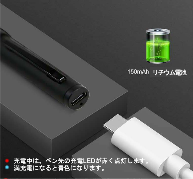 付属のType-Cの充電器に繋げば、1時間で充電が完了します。タッチペンは30分間連続使用可能で、電源は切れません。節電のため、30分ごとに自動的に電源が切れます。引き続き使用する場合は、時計回りに回転させ、再度オンにしてください。