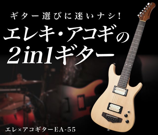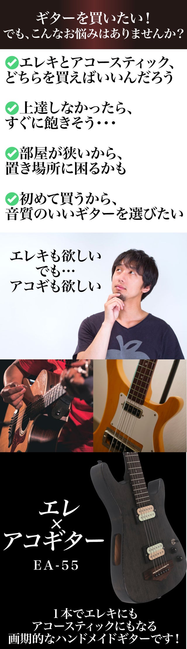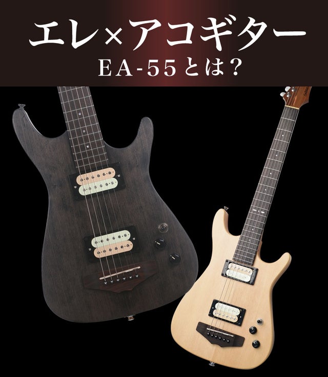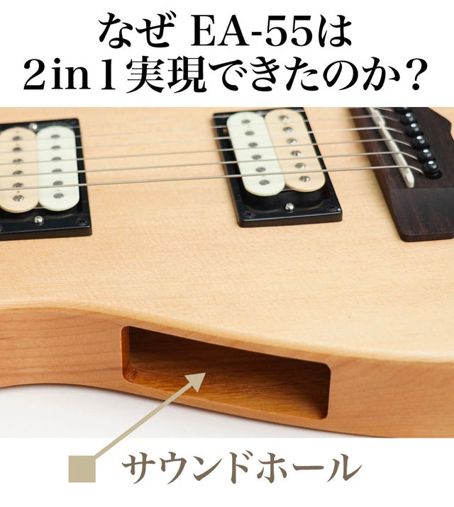 A、アコースティックギターはレゾネーター(共鳴器=ボディーの空洞)が付いているので、弦を弾けば音が響きます。一方、通常のエレキギターはレゾネーターが無いのでそれだけではエレキギターらしい音が出ません。EA-55は、サウンドホールがあるため、エレキのような形状でもアコースティックのような響きが出せます。