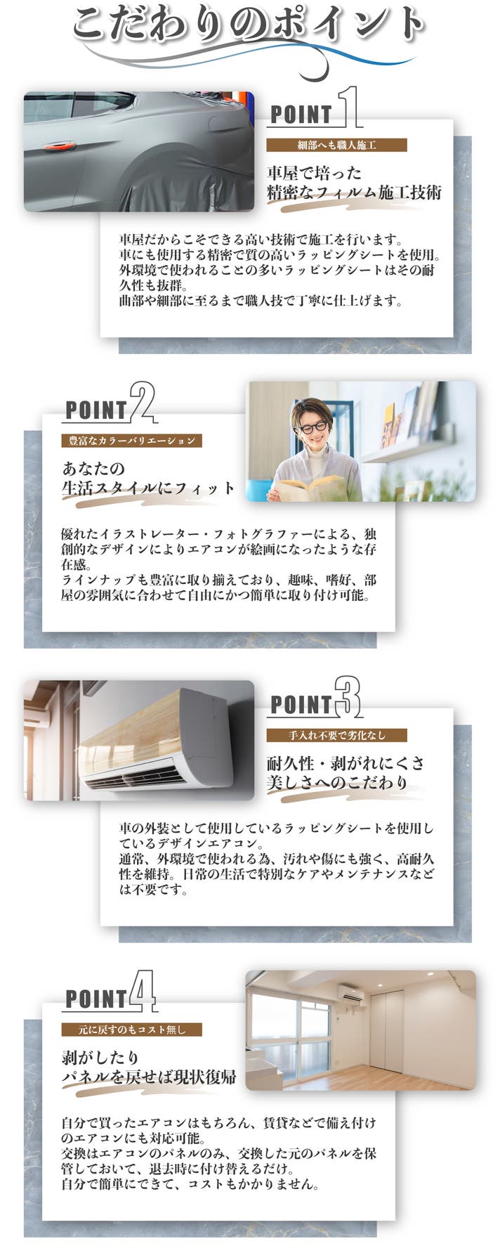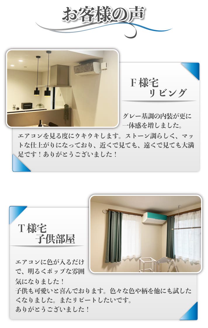 現在ご使用されている古いエアコンから新品のエアコンまでリニューアルをかけ、デザインを楽しんで頂けたらと思います。