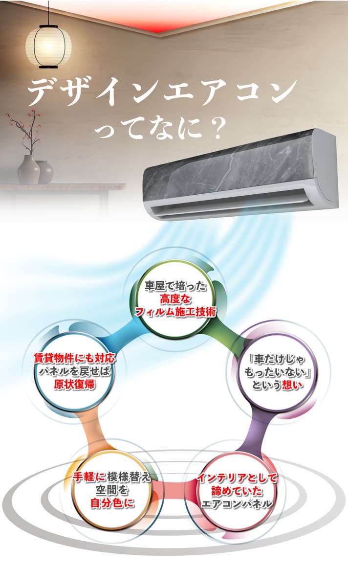 一般的にエアコンは白基調の物が多く、お部屋の雰囲気から隠すようなイメージを持たれていますが、お好みのデザインを加えることによって、お部屋の主役にもなりえるインテリアとして、隠すエアコンから魅せるエアコンへ進化することもできます。