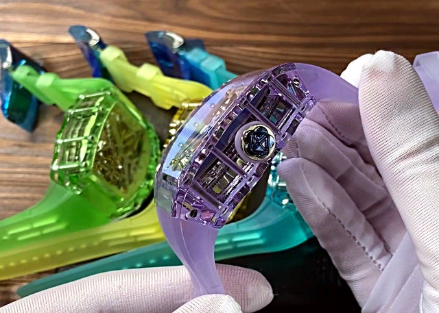 本モデルはケース全体をクリスタルガラス製としたモデルとなります。圧倒的な透明感が人気の無色透明なクリスタルガラスモデルだけではなく、カラークリスタルガラスを使用したカラフルなモデルも登場いたしました。クリスタルガラスの圧倒的な透明感とカラフルな輝きはまるで宝石を思い起こさせる美しさです。
