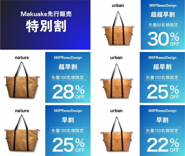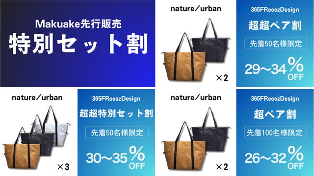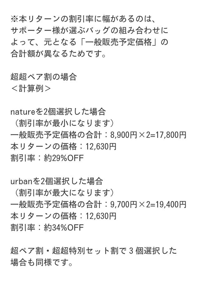 ※本リターンの割引率に幅があるのは、サポーター様が選ぶバッグの組み合わせによって、元となる「一般販売予定価格」の合計額が異なるためです。