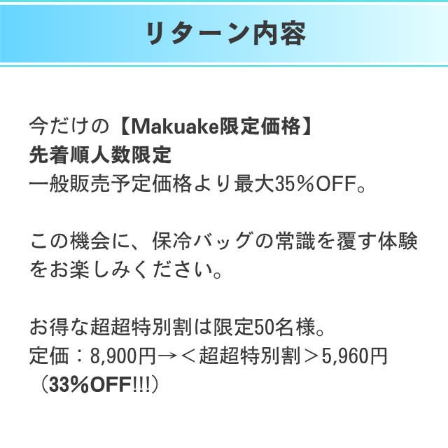 「Makuake(マクアケ)」は、実行者の想いを応援購入によって実現するアタラシイものやサービスのプラットフォームです。このページは、 プロダクトカテゴリの 「12時間氷が残る。超軽量×36L大容量。365日、タフに使える5層式保冷バッグ」プロジェクト詳細ページです。
