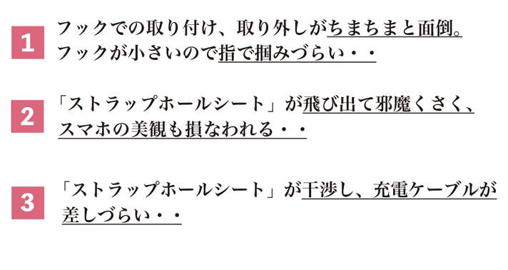 これまでのスマホショルダーストラップは、ストラップホールシートを使って、スマホとショルダーストラップを連結する使い方でしたが、下記のような問題点がありました。