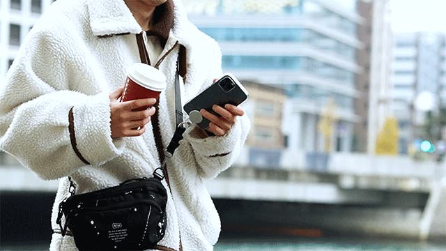 会計時に決済端末が少し遠いと、ショルダーストラップの使い勝手が悪くなるものですが、「MAGHOL」ならスマホをパパッと外せ、スマートに決済ができます。また、片手が塞がっていても、両手を使うことなく取付が可能です。