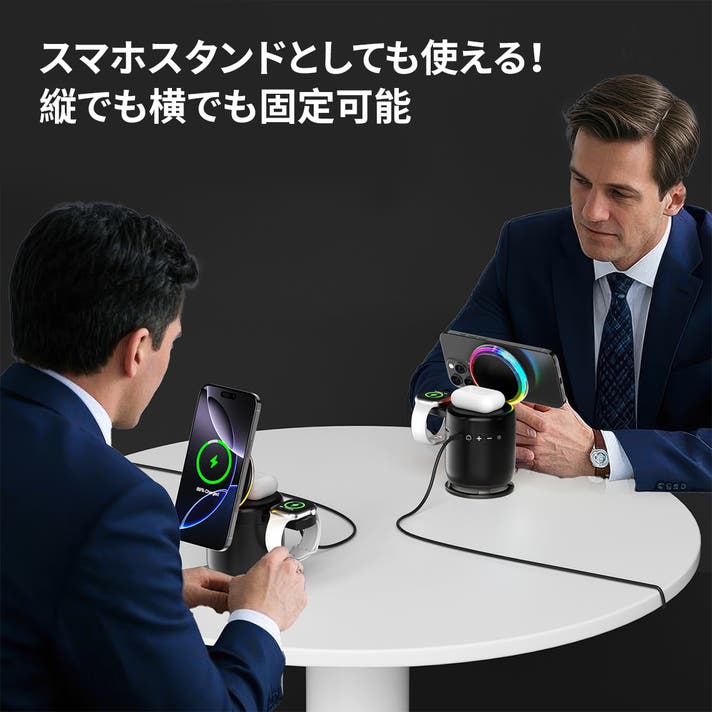 この一台で、3台のデバイスを同時に最大15Wで高速ワイヤレス充電可能。Qi規格対応で、PD・QC3.0にも対応。独立した3つの専用充電ポートにより、スマートなパワー管理を実現します。また、スマホの充電部分はマグネット式になっていて、ピタッと吸着するから安定性も抜群。縦でも横でも固定でき、そのまま動画視聴やWeb会議に活用できます。