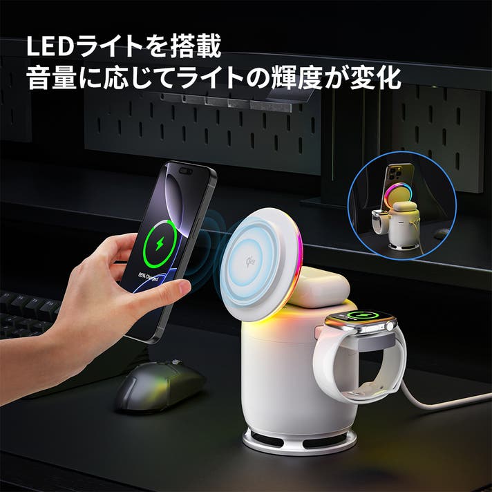 仕事中も、就寝前も、これ一台をデスクやベッドサイドに置くだけで、すべてのデバイスがスマートに充電。充電効率は最大80%で、スピーディーかつ安定したエネルギー供給を実現。ケーブルの混在をなくし、未来感あるワイヤレス充電体験をお届けします。スマホ、AirPods、Apple Watch——異なる充電器に煩わされていた日々に、終止符を。