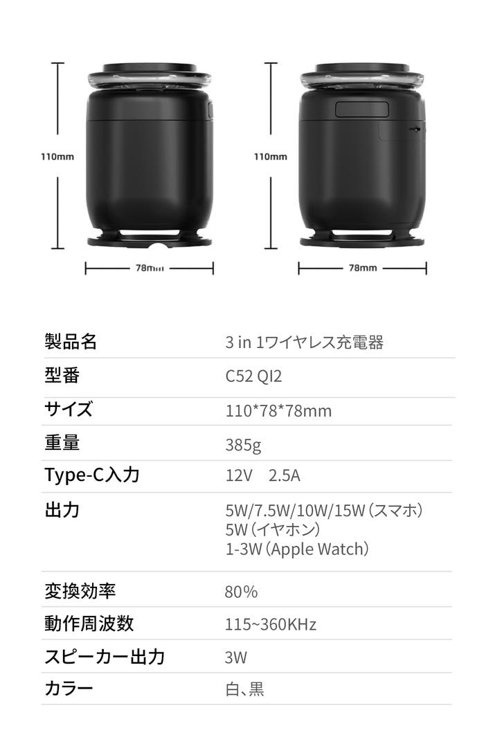 ご注意:本製品はスピーカーとワイヤレス充電器を一体化した多機能設計のため、12V/2.5A以上のPD対応アダプターと、4A以上のType-Cケーブルをご使用ください。5V出力の通常アダプターでは正常に動作しない場合があります。