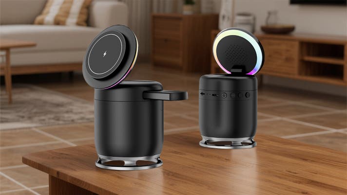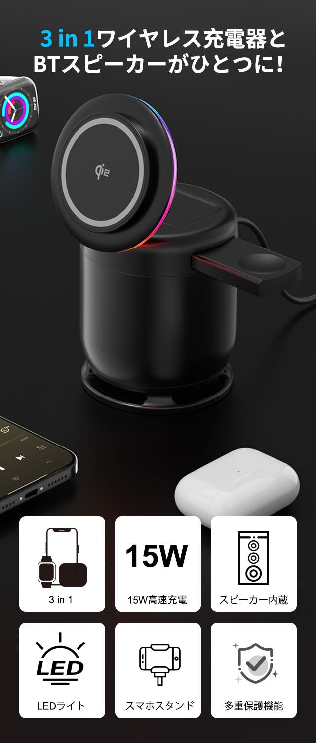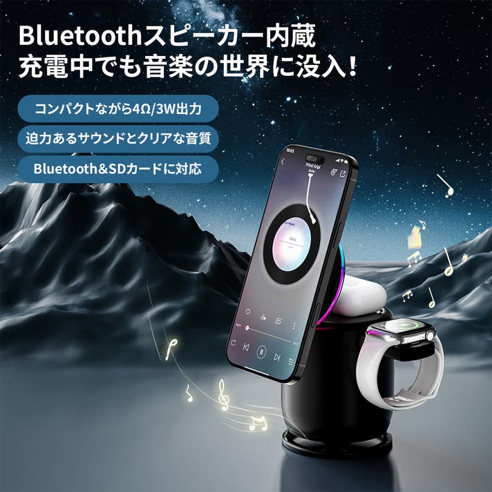そこで私たちは、“ひとつにまとめる”という選択をしました。ワイヤレス充電、Bluetoothスピーカー、LEDライト。それぞれが単機能で終わらず、ひとつの製品の中で自然に連携する。その結果生まれたのが、この「3 in 1 ワイヤレス充電器」です。