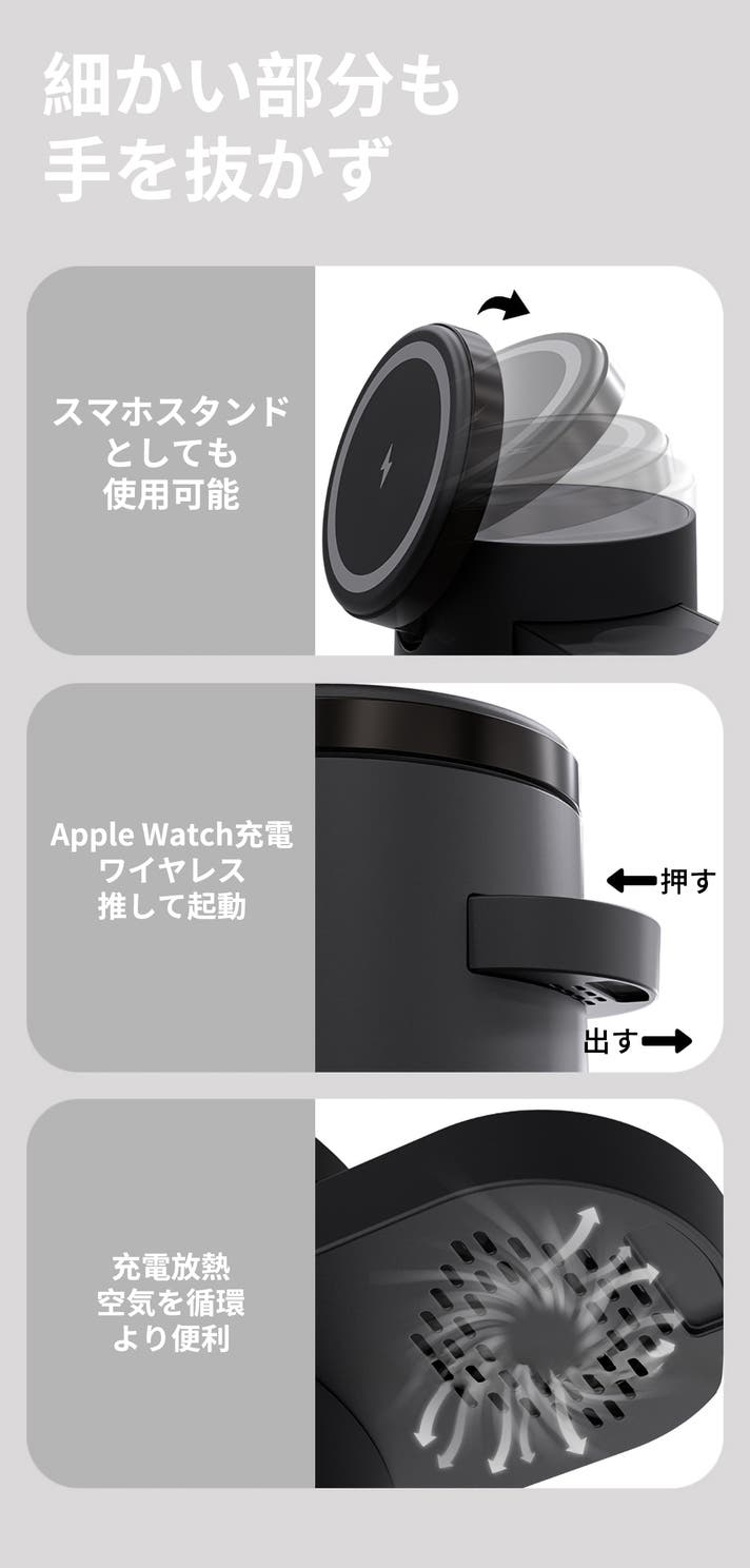 - スマホ・AirPods・Apple Watchの3台を同時に高速ワイヤレス充電!