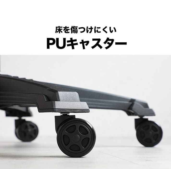 PU製のキャスターを採用。一般的な「硬い」キャスターに比べチェアを動かした際に音がしづらく、フローリングの床で使っても傷をつけにくい素材です。