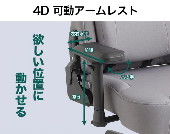 さらに、アームレストは『ハの字』だけでなく、高さ、前後、左右水平と4方向に動かすことができます。