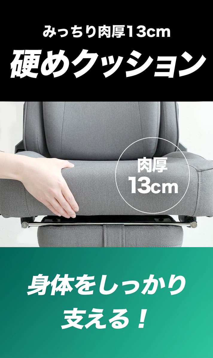 ウレタンがみっちりと詰まった13cmの肉厚座面で、体をあずけられるしっかりとした安定感。