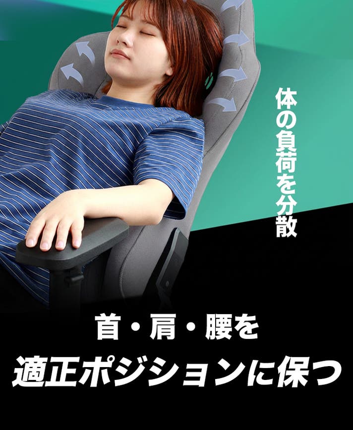 前面に緩いカーブを描く縁が、首・肩・腰を適正ポジションでホールド。さらに、左右に張り出した肩サポートが肩の負荷を分散させます。