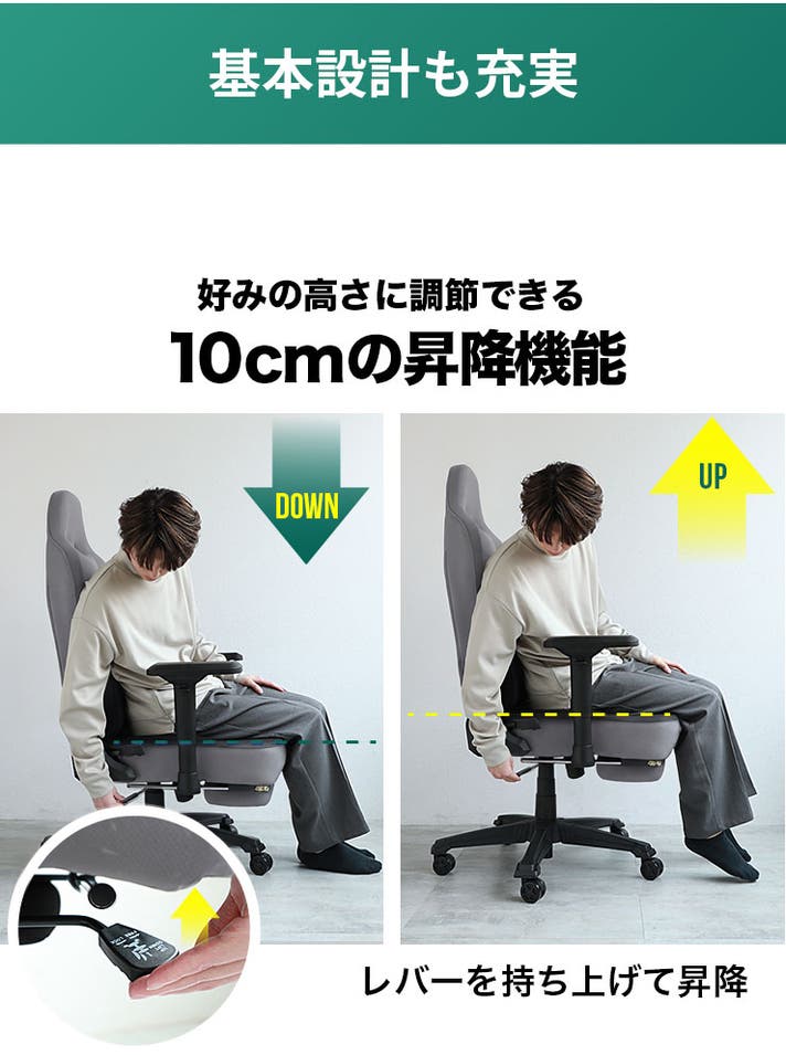 体勢や腕の位置に合わせて、欲しい位置にアームレストを動かせます。