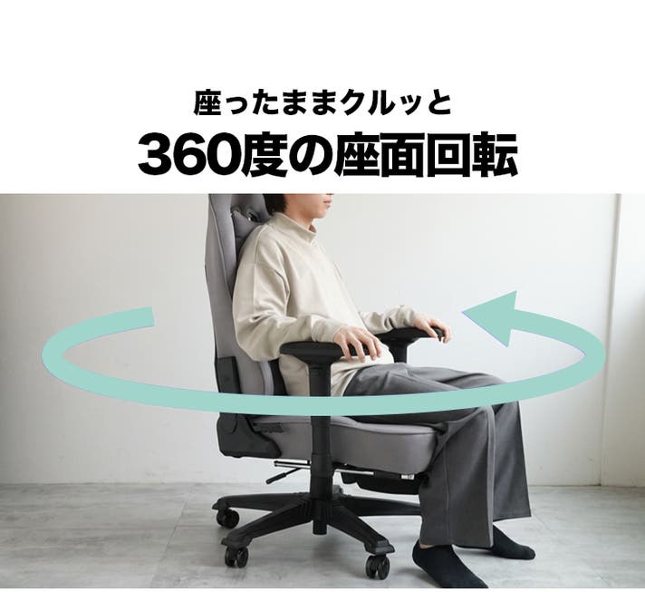 座面は360度回転。席を立つときも、後ろの本棚に手を伸ばす時も、体をひねることなく座ったままスムーズです。