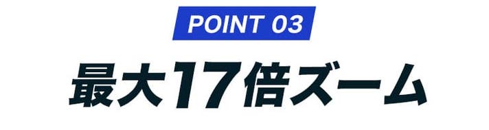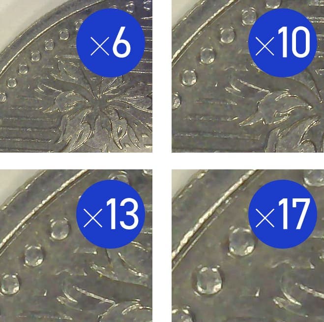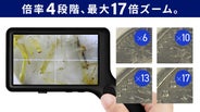 光学ズーム6倍とデジタルズームを組み合わせ、最大17倍までの拡大が可能。ボタンひとつで、6倍・10倍・13倍・17倍の、4段階に倍率を切り替えられます。