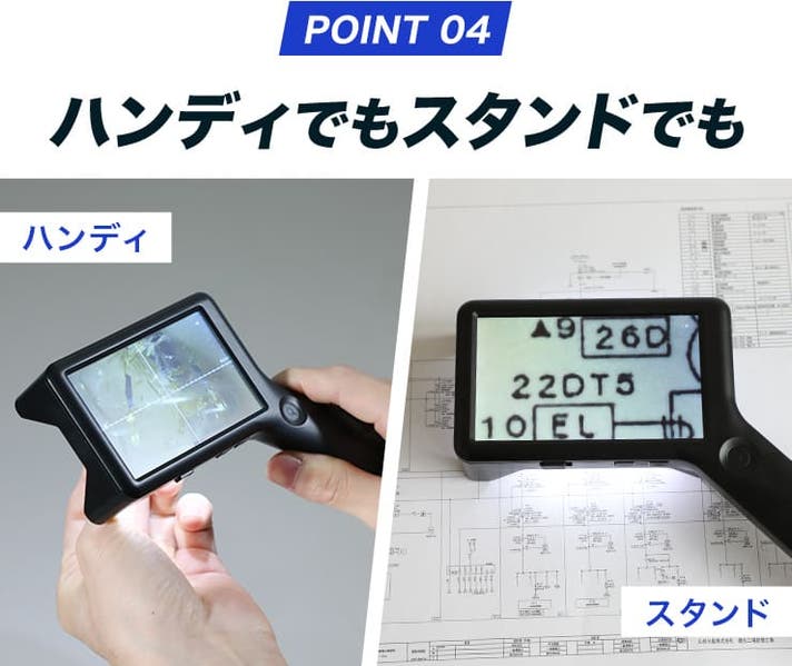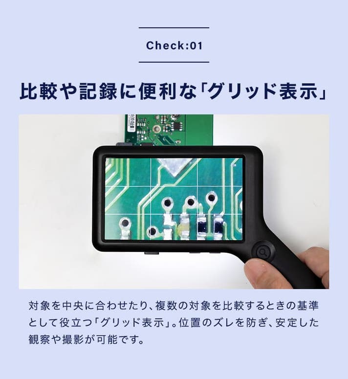 虫眼鏡やルーペでは見落としがちな細部も、4インチの大画面モニタなら、大きく鮮明に見ることができます。