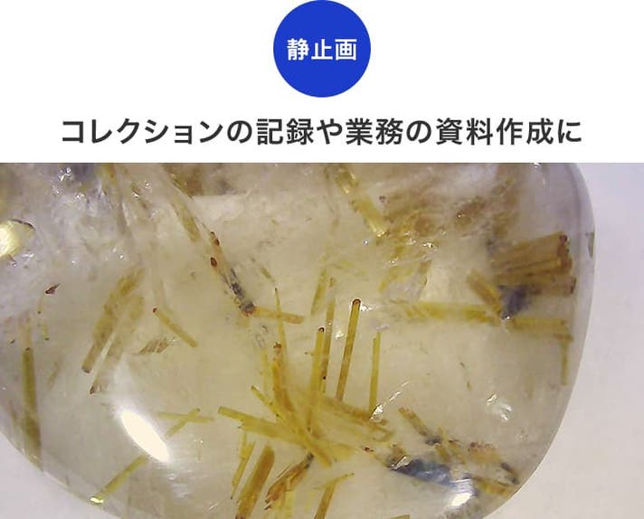 拡大した状態を静止画として保存できます。小さな対象も鮮明に記録できるため、趣味のコレクションを残すのはもちろん、業務での確認やレポート、資料作成にも活用可能です。