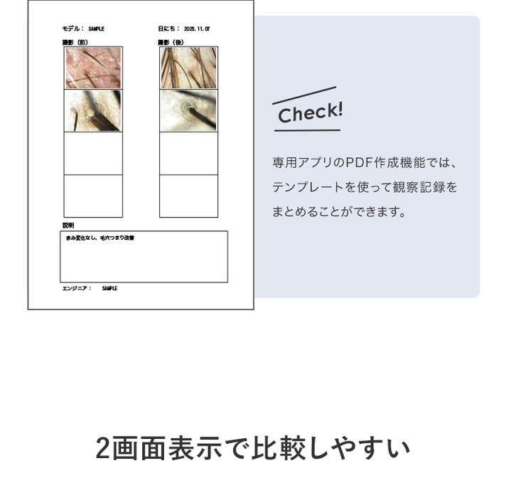 - 毛髪の変化や皮脂の詰まり、肌のキメ状態を“見える化”し、目に見えないケアの効果を実感