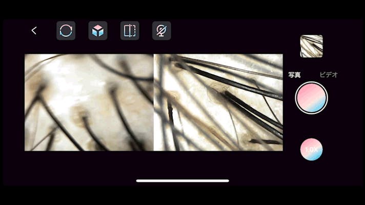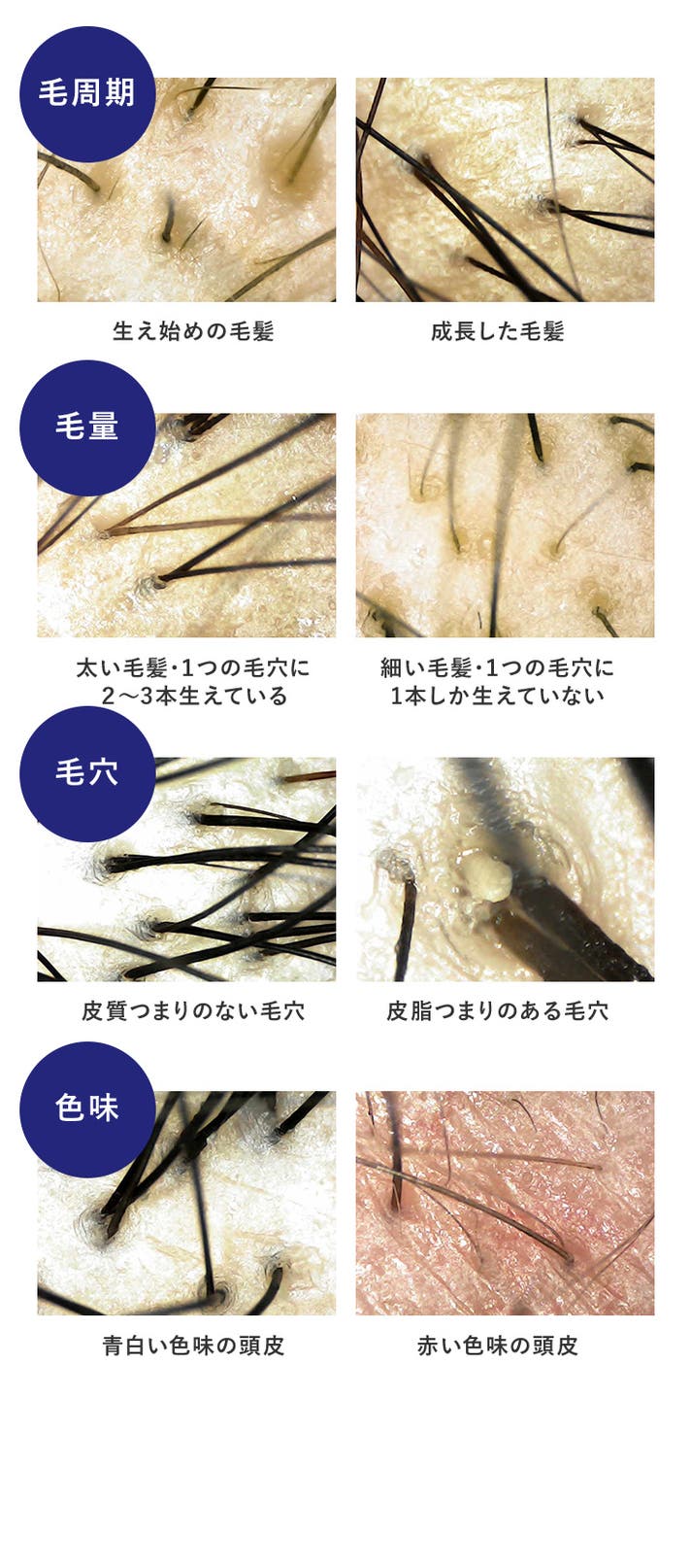 マイクロスコープで頭皮を観察すると、毛周期、毛髪の太さ・密度、毛穴の詰まりや皮脂の状態、赤くなっている、頭皮がめくれている等がわかります。