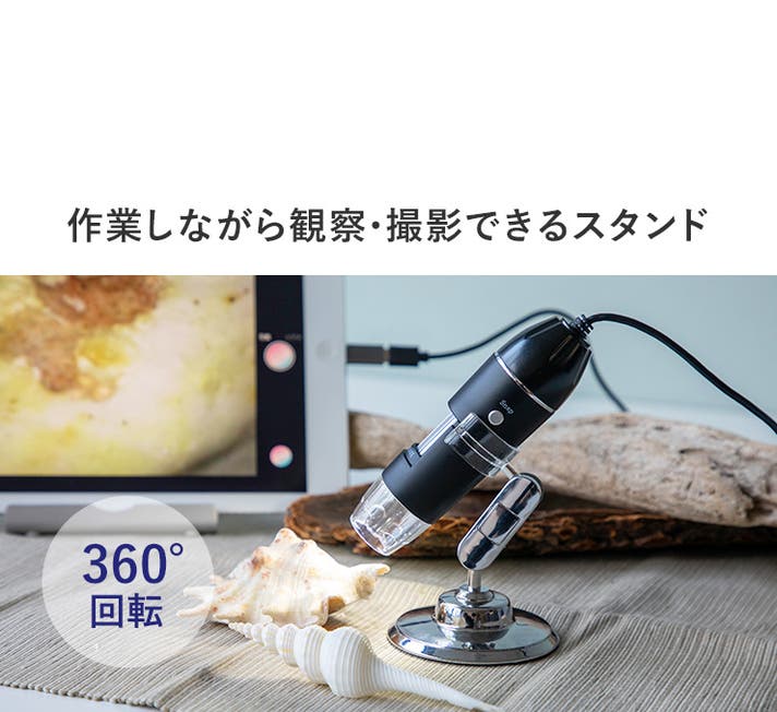 手ブレを抑えて安定した観察が可能な専用スタンド付き。