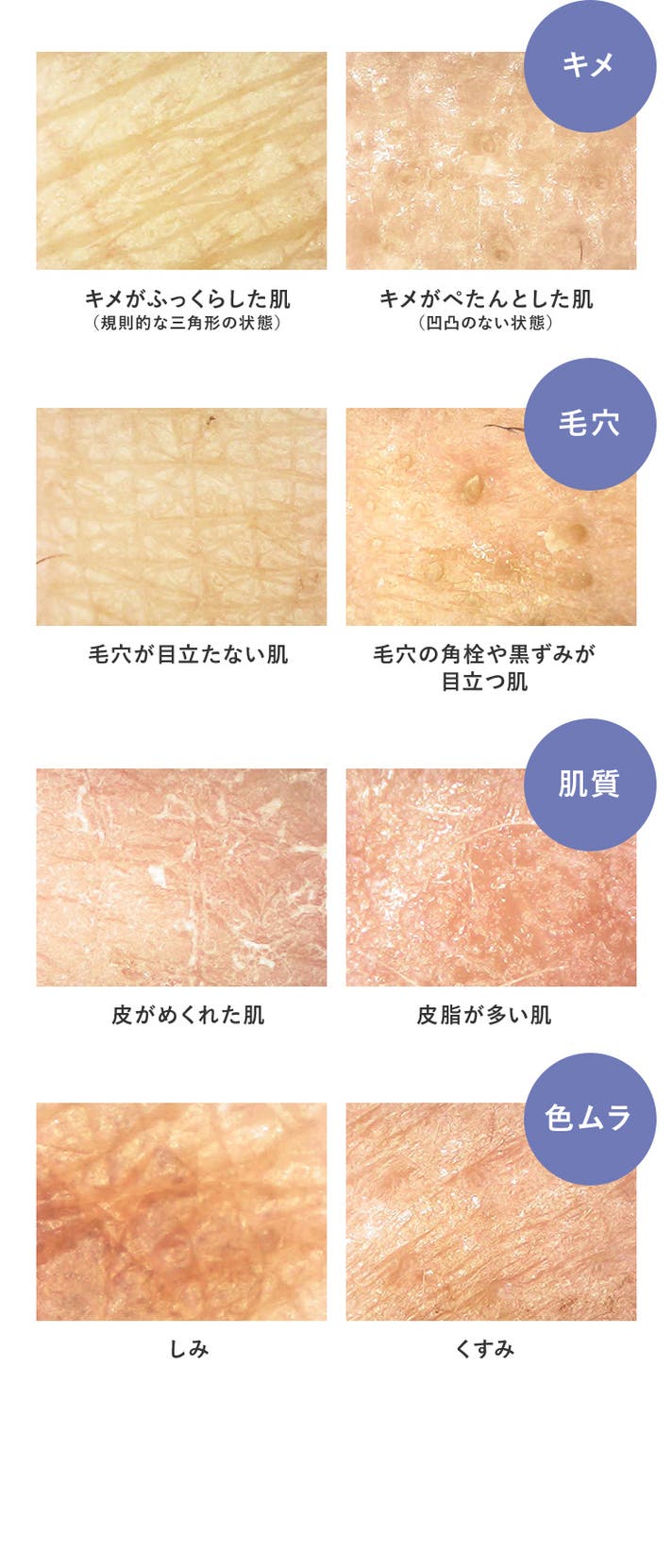 マイクロスコープで肌を観察すると、角質やキメ、毛穴の汚れや開き、皮脂バランス、しみやくすみの有無などがわかります。