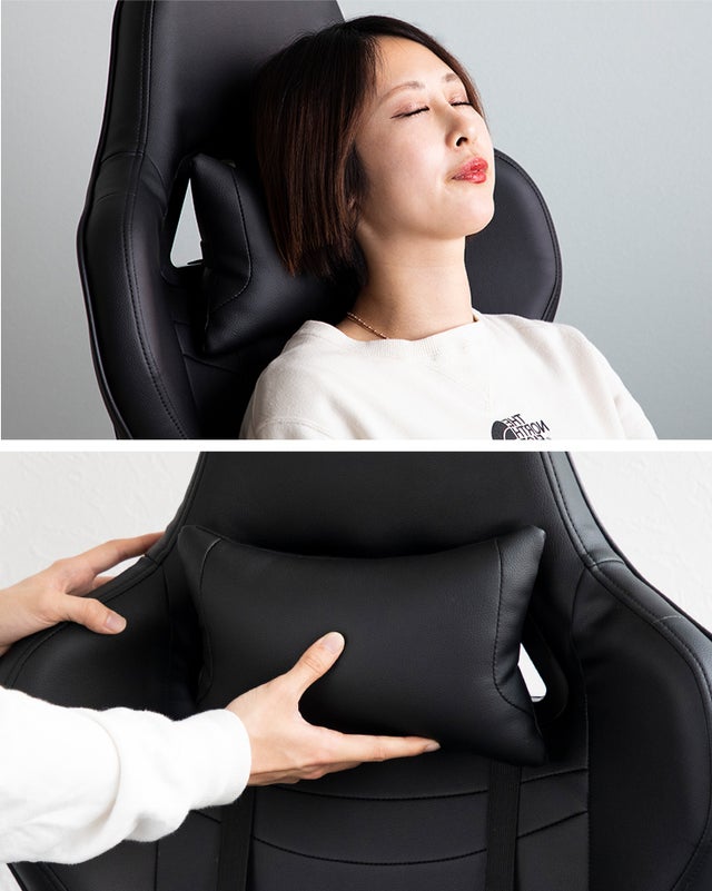 首と頭を支えるヘッドレストにも、横26.5cm×縦18cm×厚み9.5cmの肉厚クッションを完備。ゴムバンドで背もたれに留めている形なので、姿勢や体位置、身長に合わせ位置を微調整することができます。