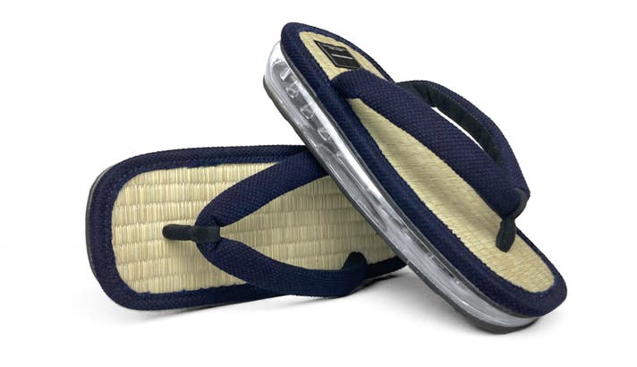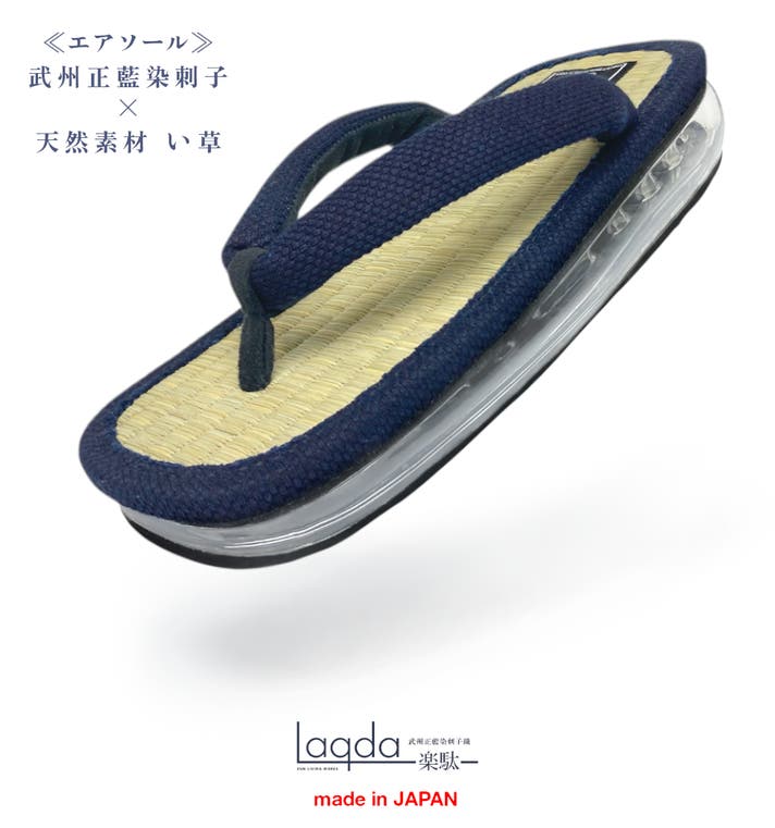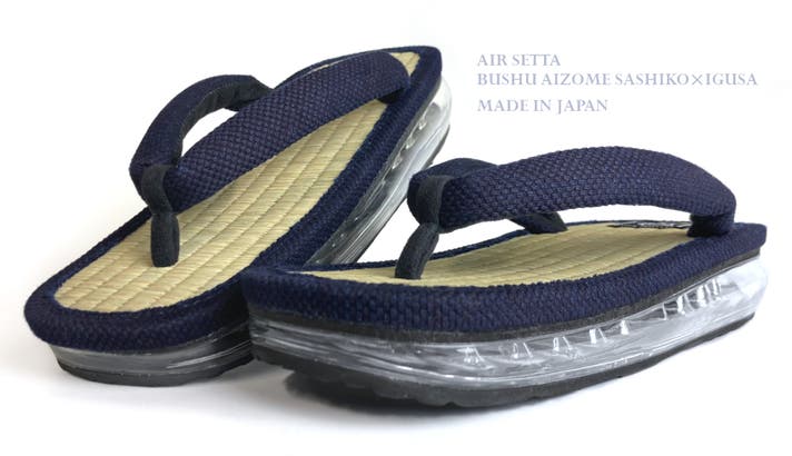日本独自の【伝統】【職人技術】【スタイル】を継承しながらもハイテク技術との融合を実現することで、現代にマッチした新しいモノができる。ハイテク技術を用いた雪駄専用のエアー底と伝統文化である「武州正藍染生地」×畳などで親しみ深い「天然い草」を贅沢に使用し、国内生産にこだわり改良した、現代的な雪駄が完成いたしました。
