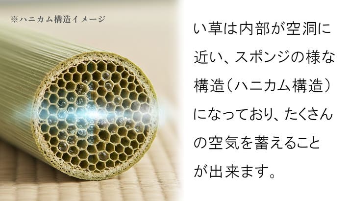 い草には有害物質を吸着し、分解する力があることも分かっており、嫌なにおいを軽減し、い草本来の爽やかな香りに変えてくれます。