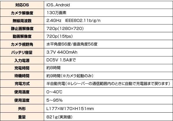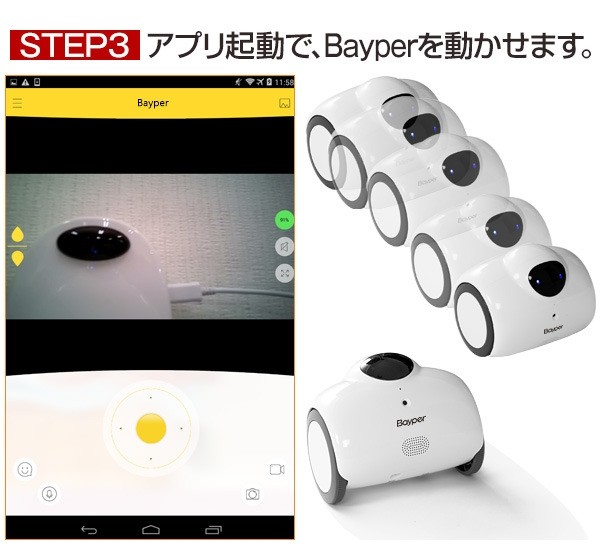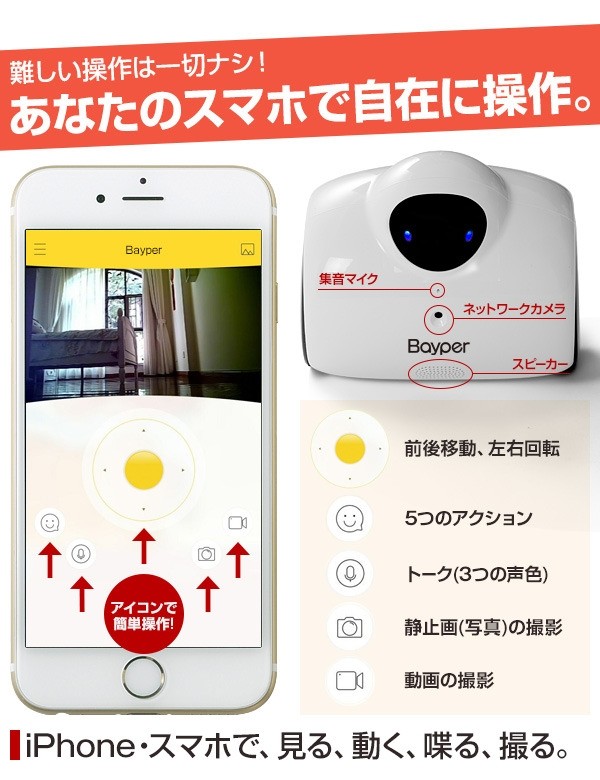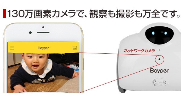 「Bayperバイパー」の胸部に搭載している130万画素カメラ。このカメラで、あなたの大切な存在を映し出し、静止画・動画の撮影ができます。もちろん、前後左右動きながらのリアルタイム映像があなたのiPhone・スマホに届きます。(静止画:720p【1280×720】 動画:720p【15fps】)