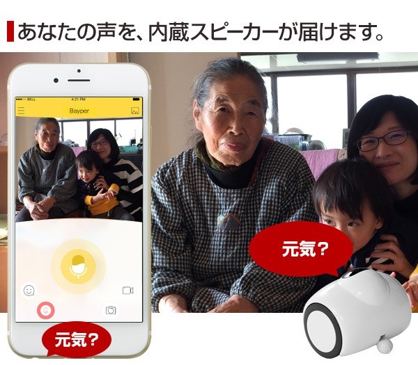 例えば、離れて暮らす家族や、お父さんお母さん。「元気にしてるかな?」そんな時もiPhone・スマホでアプリを開くだけで様子を見ることができ、テレビ電話や5つのアクションで気持ちを伝えることもできます。愛くるしい「Bayperバイパー」を通して、素敵なコミュニケーションがとれます。