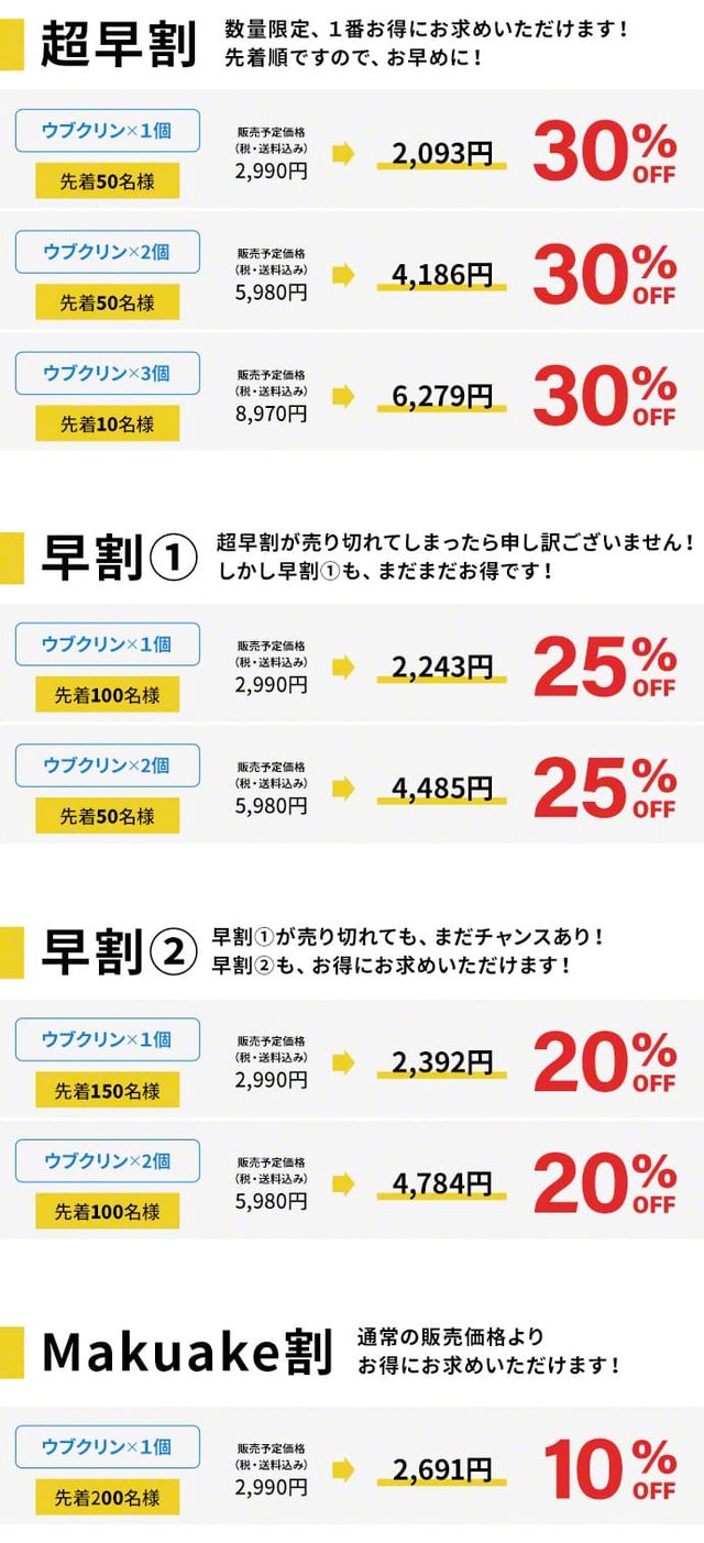一般販売よりも先に、いち早くウブクリンを手に入れることができます。