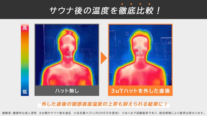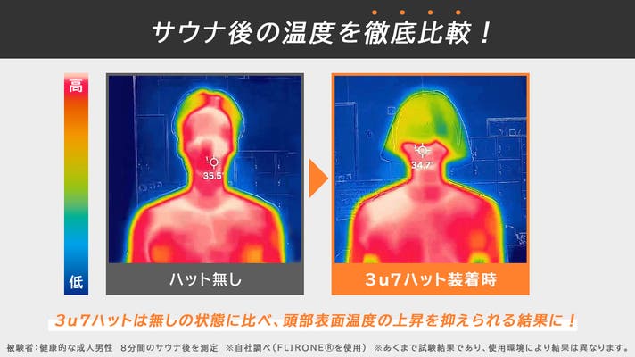 サウナハットをかぶっていた時の方が、頭部の温度が低い結果になりました。