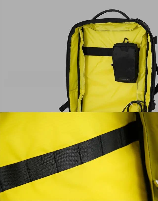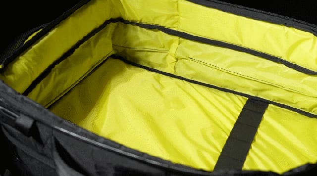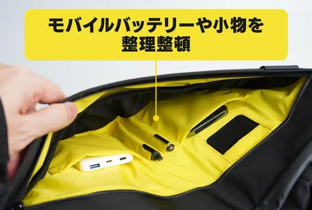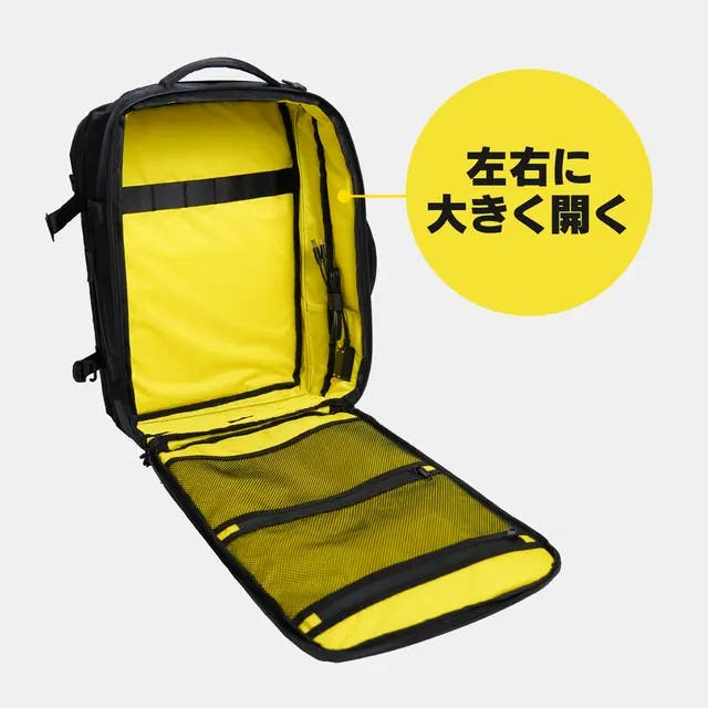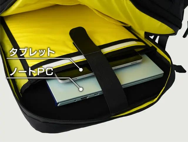 ブラックやシルバー、ホワイトといったカラーが多いガジェット類や中の荷物が見つけやすいよう、視認性が高いハイビズイエローを採用。