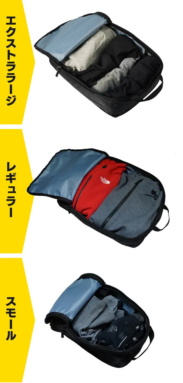 レギュラーは Tシャツ4枚とジーンズ2本、スモールはTシャツ2枚とショーツ2枚程度の収納が可能です。※