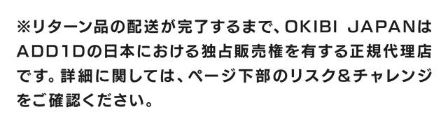 プロジェクトに関する情報 ・プロジェクトの属性:輸入商品 ・代理店によるサポート:商品お届けから1年間保証 ・プロジェクト実行者(国):日本 ・製品者(国):香港 ・製造者(国):中国 ※並行輸入品が発生する可能性があります。正規以外での個人輸入等は、完全に防ぐことができない場合がございます旨、予めご了承のほどお願いいたします。 ※リターン品の配送が完了するまで、OKIBI‐JAPANはADD1Dの日本における独占販売権を有する正規代理店です。並行輸入品が発生する可能性がございますが、並行輸入品には正規代理店による製品サポートを受けることができません。 また、正規代理店を通じて購入することで、日本国内での流通に必要な各種認証の取得や、関税の適切な処理が担保されます。 ※使用感などに関しては、感じ方に個人差が予想される製品でございます。そのため、使用感等に関する返品・返金はお受けいたしかねます。 ※初期不良以外に関する返品・返金はお受けいたしかねます。 ※デザイン・カラー・素材などの仕様が一部変更になる可能性がございます。 ※モニター環境によって、画像の色が実物と異なって見える場合がございます。 ※応援購入の数が想定を上回った場合、製造工程上の都合等により出荷時期が遅れる場合がございます。 ※皆様から想定を上回る応援購入を頂き、量産体制を更に充実させることができた場合、一般販売価格が予定価格を下回る可能性がございます。 ※本文中に記載させていただいたスケジュールは、あくまでプロジェクト公開時点の予定です。応援購入の性質上、配送遅延のおそれがございます。原則として、配送遅延に伴う応援購入のキャンセルはできませんが、リターン配送予定月から3ヵ月を超えた場合には、希望者に限りキャンセルにて対応させていただきます。 以上の注意点につきましてあらかじめご理解とご了承いただいた上で応援購入くださいますよう、よろしくお願い申し上げます。 最後に、本製品を手に取った皆様に喜んでもらえるよう、チームメンバー一同心を込めて対応していきますので、 応援よろしくお願い致します。