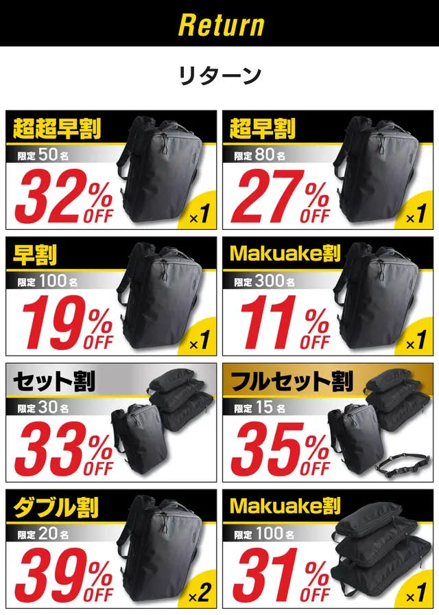 バックパック+圧縮バッグ+ストラップ【フルセット割35%OFF】15名限定