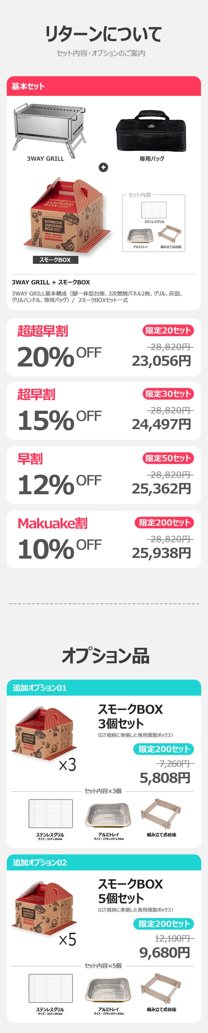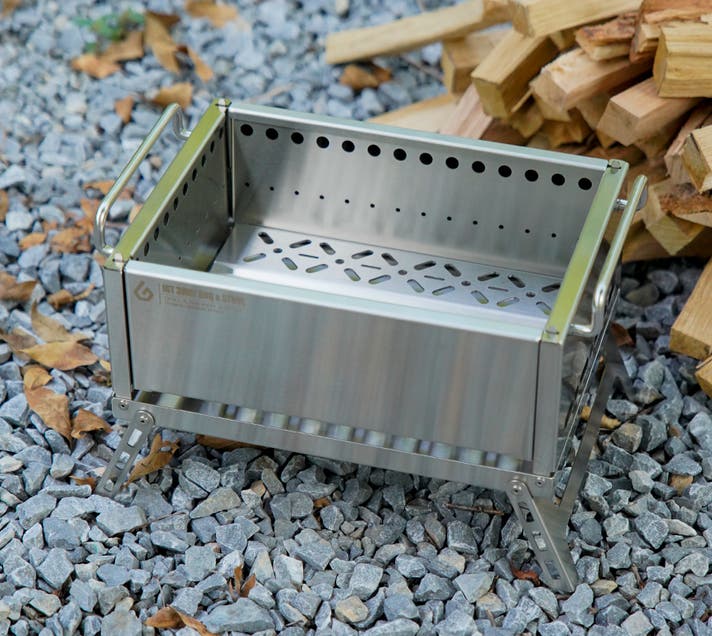 前回のプロジェクトで多くの方からいただいた「煙が少なくて快適に焚き火ができた」「丈夫だけともう少し軽いものがあると嬉しい」というお声から、今回の新作では「焚き火の快適さ」と「荷物の削減」という2つのテーマをさらに追求した商品になります。BBQ、焚き火、そして卓上での燻製まで、これ1台で3つの楽しみを提供します。