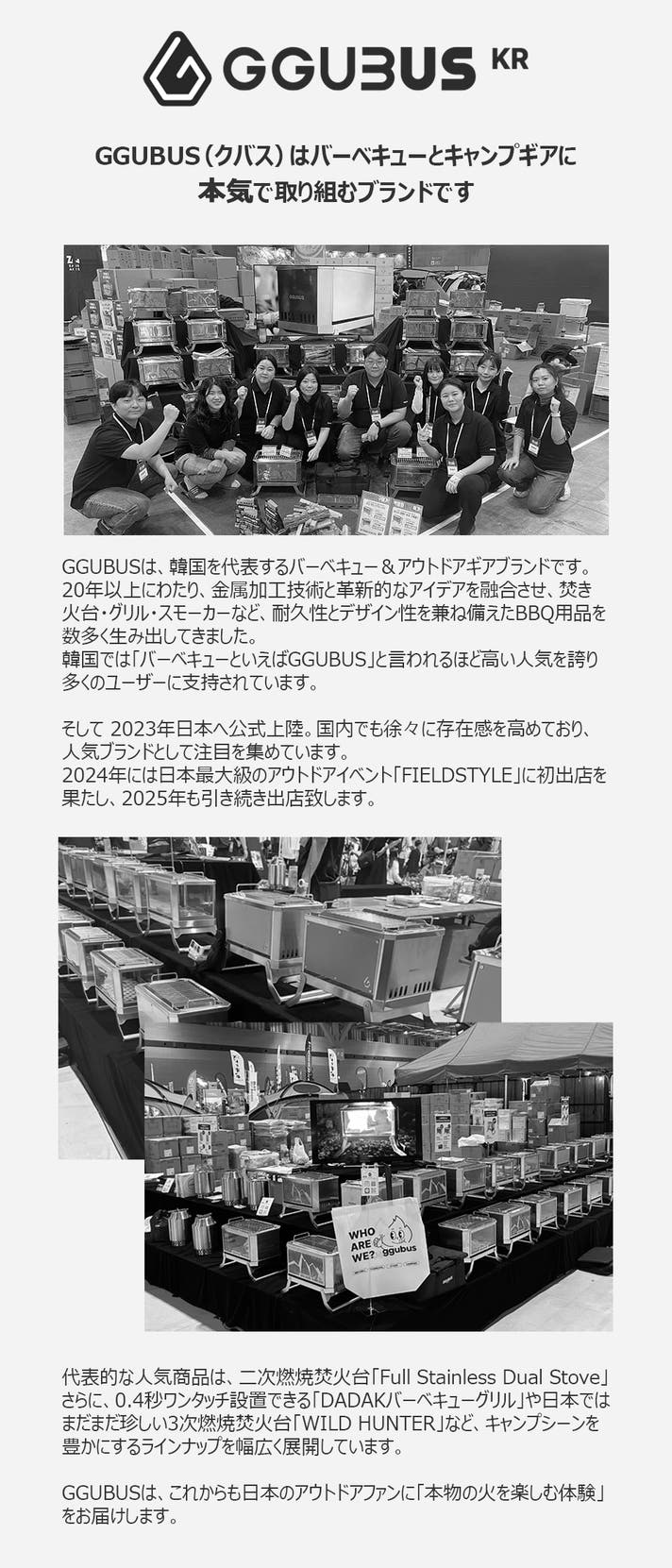 私たちは、韓国で20年以上にわたりバーベキュー用品を製造・販売してきたブランド、GGUBUSの製品を日本の皆様にお届けしています。これまでにFull Stainless Dual StoveシリーズをMakuakeでご紹介し、多くの方にご支援いただき、心から感謝しております。