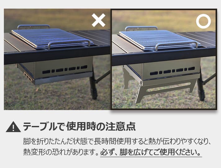 A:高温状態が長時間続くと、熱がテーブルに伝わりテーブルが損傷する恐れがあります。焚火台として使用する際は、必ずテーブルから取り外してご使用ください。