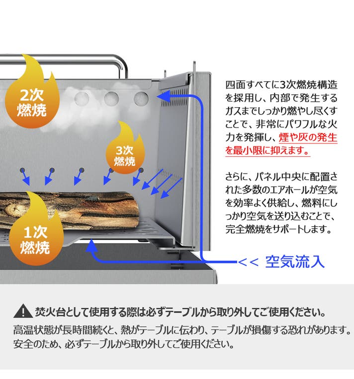 A:3WAY GRILLを焚火台として使用する際は、3次燃焼機能が活躍します。3次燃焼とは、2次燃焼で燃え残った未燃焼のガスや煙を再度燃やし、熱効率を高めながら、灰や煙の発生を最小限に抑え、快適でクリーンな使用感を実現します。煙が苦手な方や、焚き火の臭いが苦手な方におススメです。