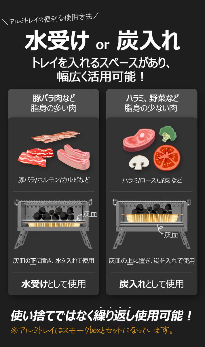 A:アルミトレイのみ単品での販売はしておりません。スモークBOXを追加でご購入いただければ、複数回利用可能なアルミトレイが付属しますので、そちらをご利用いただくか、水受けや炭入れ用のアルミトレイは、サイズが合えば市販のアルミトレイやステンレストレイ等で代用可能です。