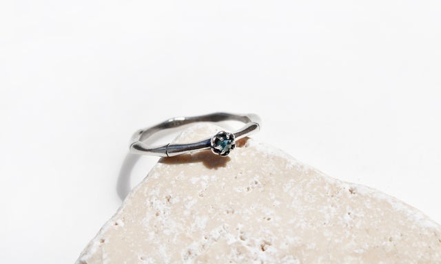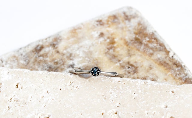 フロールは約3mmの1部以上の重量のラフダイヤモンドがセットされたリングで、小さく繊細な花びら状のラメがメインのダイヤモンドを包み込むディテールが調和したデザインです。 ストーンサイズが一番大きくて最も人気のあるデザインで、全体的に繊細な花形が強調されたアンティークなデザインで、フロール一つだけ着用しても豊かな感じの指輪です。