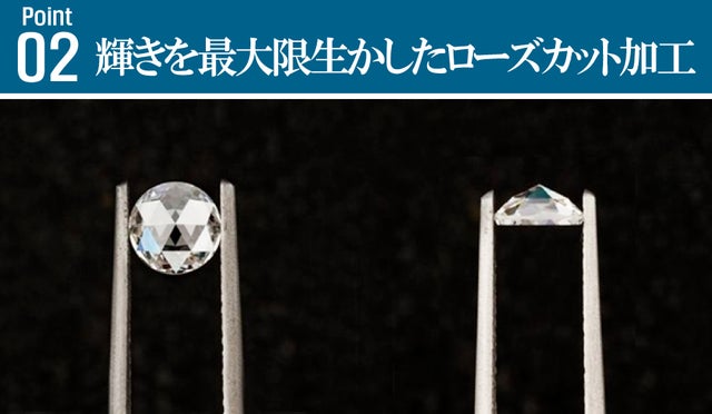 ローズカットダイヤモンドの目立つ特徴は、平らな底面と三角形の面(パペット)に覆われた半球形の上部です。 様々な角にカットされ、ラフダイヤモンド固有の輝きを最大限生かします!