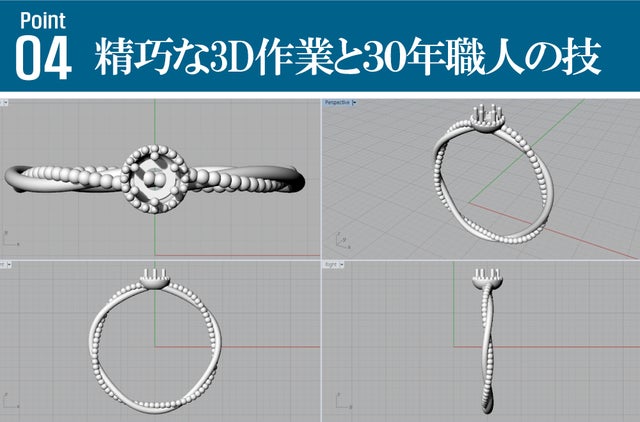 ジュエリーは精巧ながらもディテールがうまく表現されなければならないため、細かい作業が必要です。構想したジュエリーデザインは、CADで3D作業を経た後、
